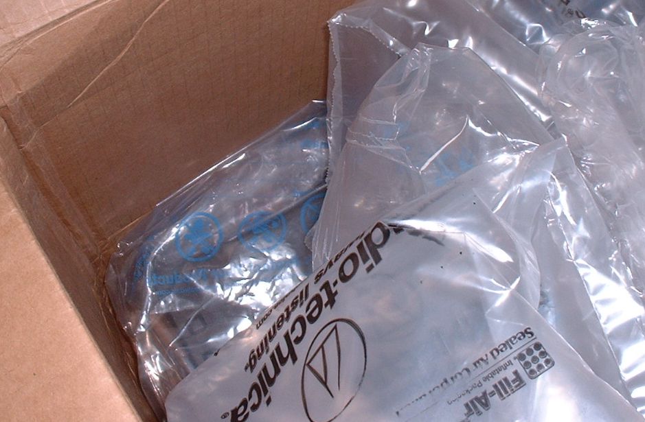 This was how a large fifty pound Crown amp was packed. These bags do not hold up well under weight and they shift around so much that the amp ended up on the bottom of the large box unprotected, and with a bent rack ear. Luckily the bent rack ear was all that was damaged. This is why we say to tightly wrap these with bubble wrap and tape it. And combine it with peanuts!